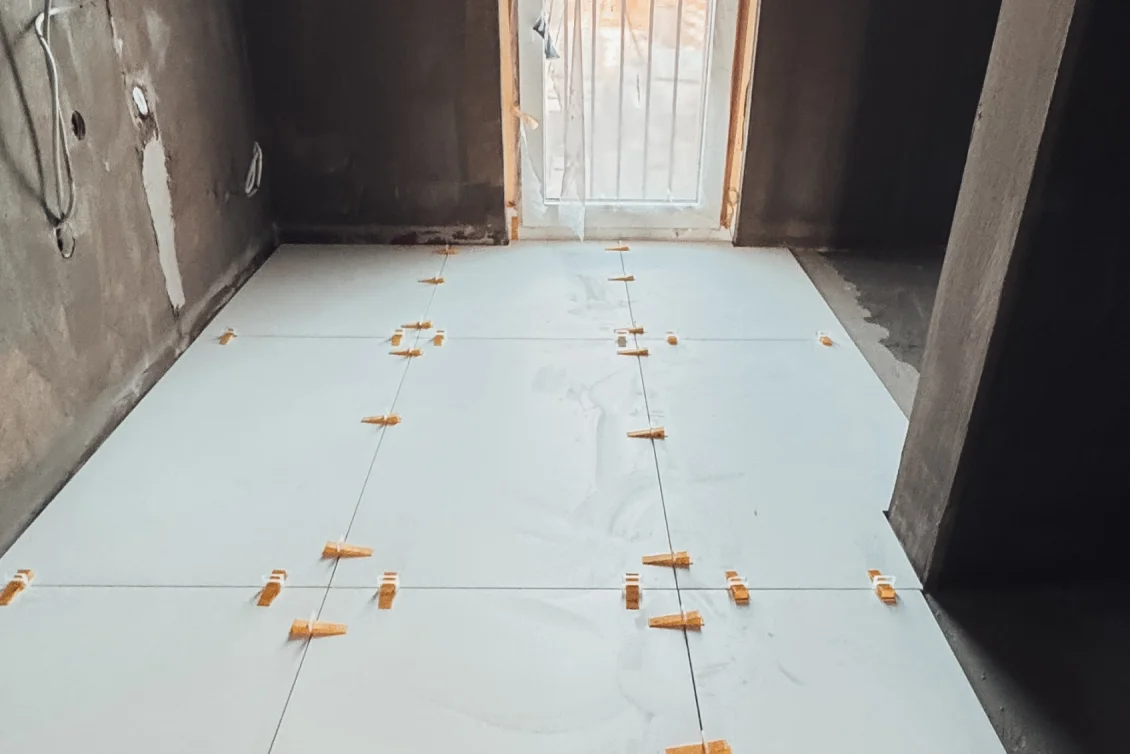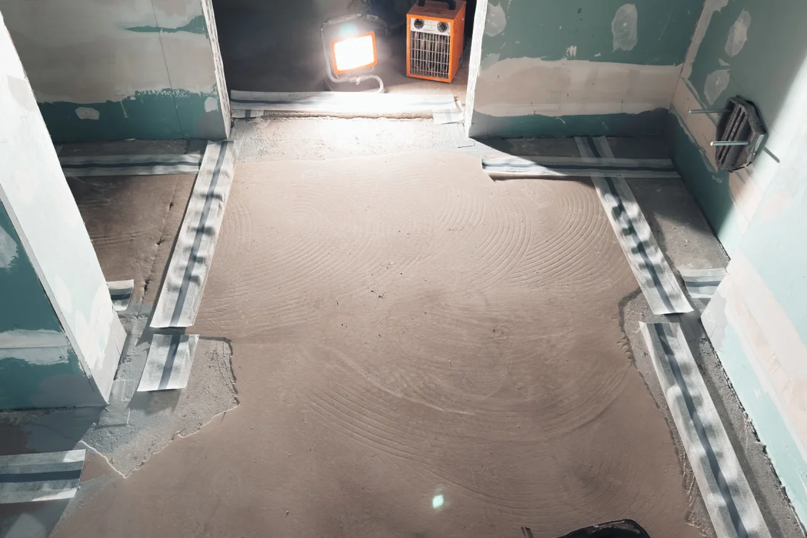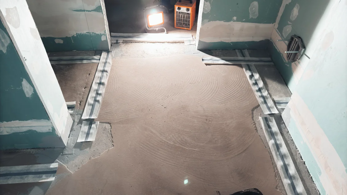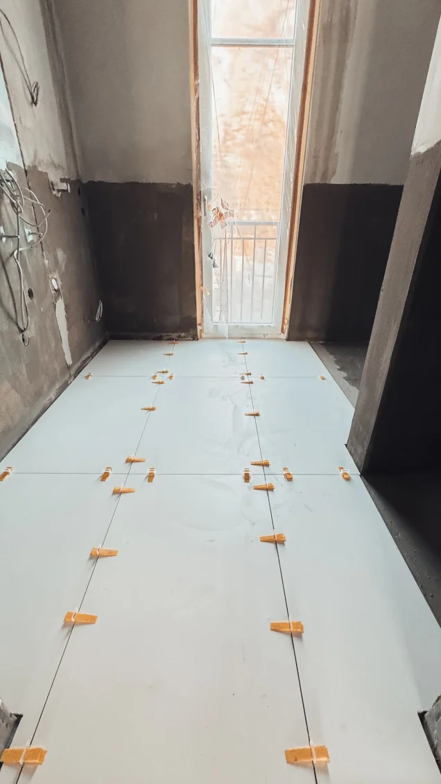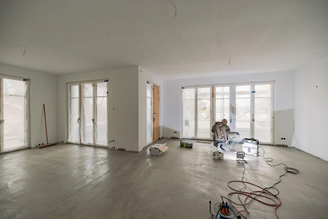 Die initialen Abdichtungsarbeiten zur Vorbereitung der Fliesenverlegung sind nun erfolgreich gestartet. Im Anschluss daran erfolgt die fachgerechte Verlegung der vom Eigentümer ausgewählten Fliesen. Zudem wurde der Untergrund für das Parkett sorgfältig vorbereitet, um eine optimale Grundlage für die weitere Gestaltung zu gewährleisten.