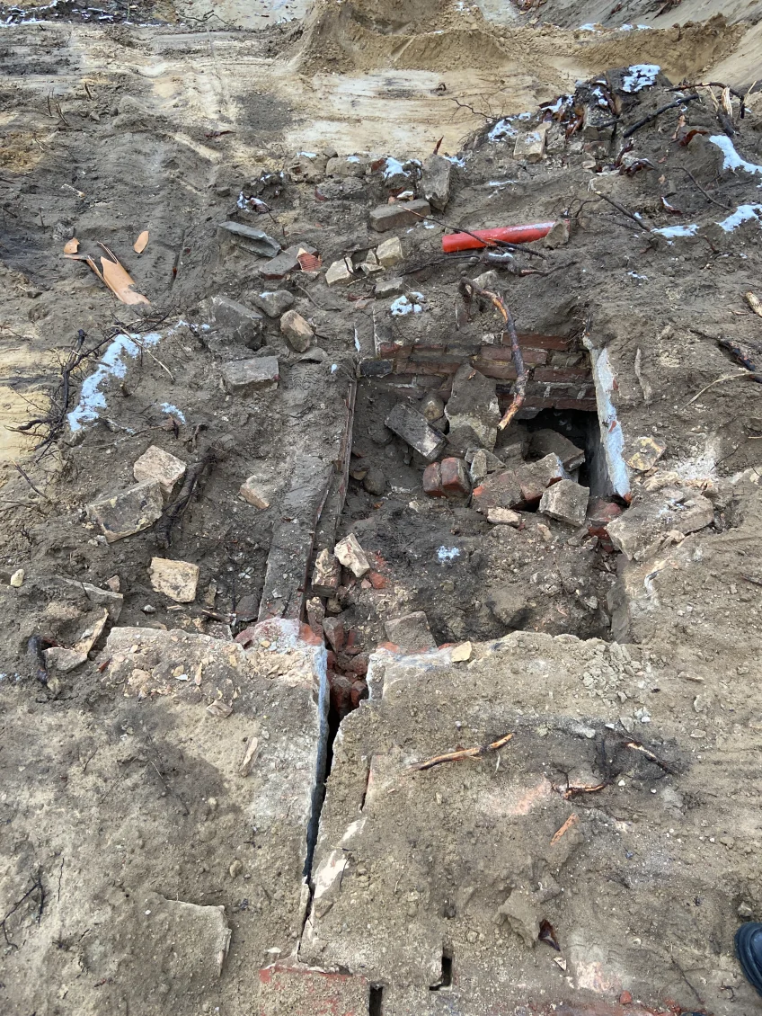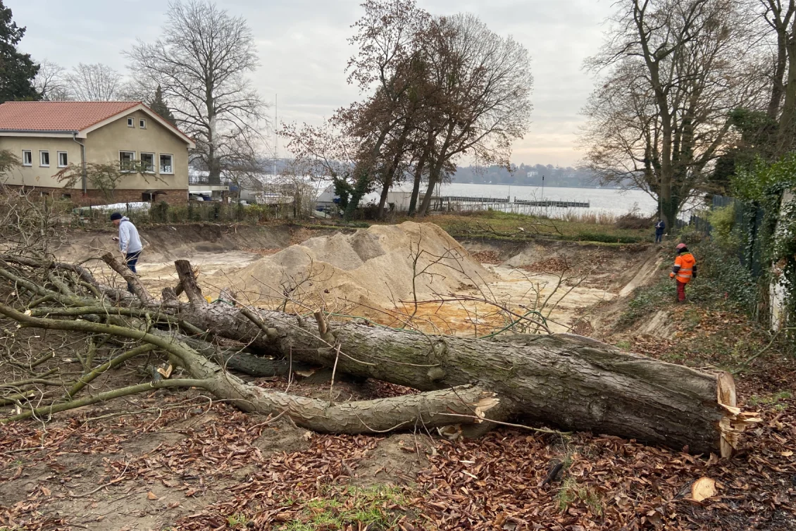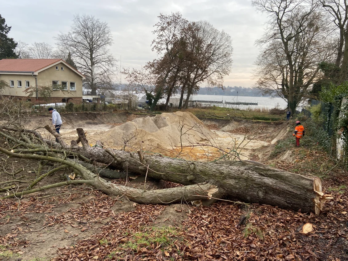 Bruchgefährdete und stark beschädigte Bäume müssen gefällt werden. Auch im tiefen Baugrubenbereich finden sich oftmals ‘Überraschungen’ – hier leider nur ein verfüllter Abwasserschacht.