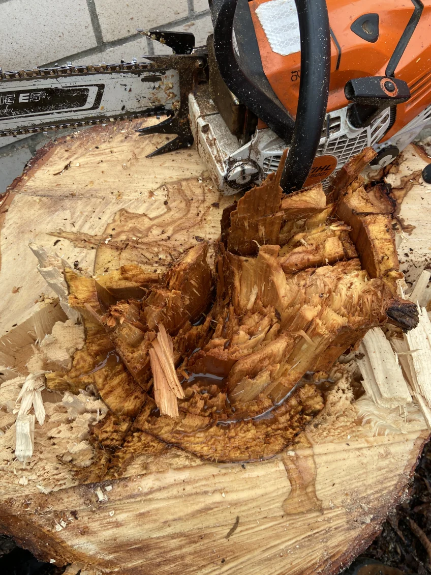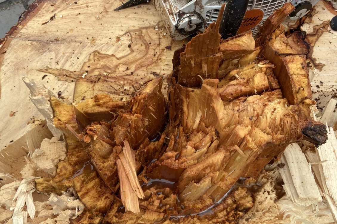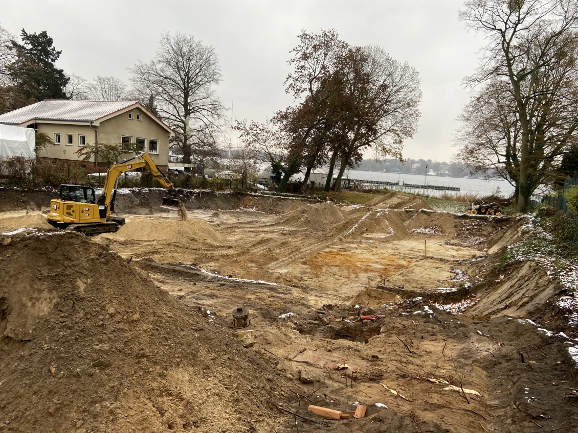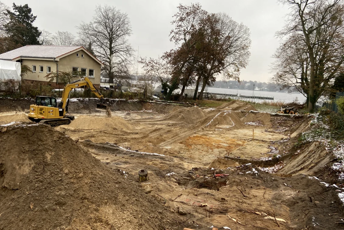Bruchgefährdete und stark beschädigte Bäume müssen gefällt werden. Auch im tiefen Baugrubenbereich finden sich oftmals ‘Überraschungen’ – hier leider nur ein verfüllter Abwasserschacht.