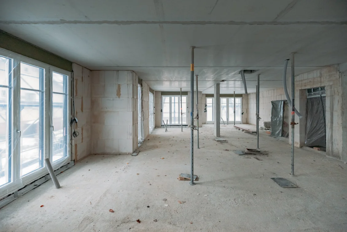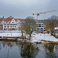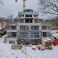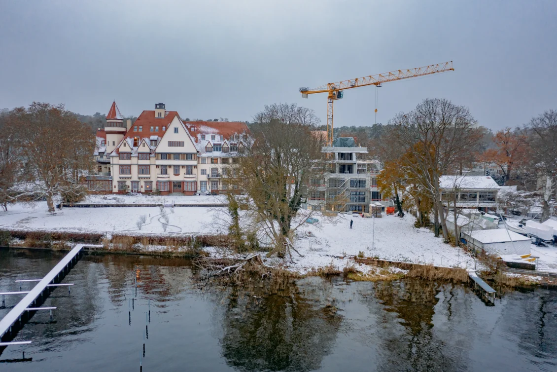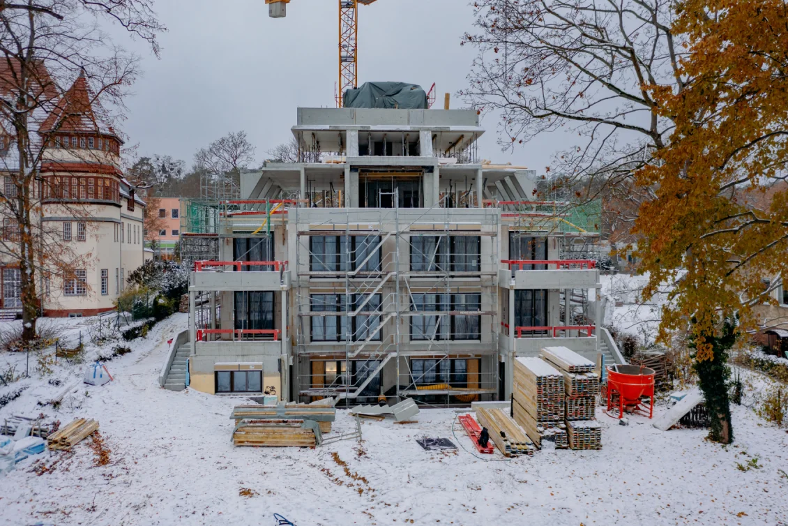 Das in Schnee gehüllte Gebäude wird von innen beheizt, nicht nur zur Beschleunigung der Trocknungsprozesse, sondern auch als Rückzugsort für die Baustellenmitarbeiter. Indes lässt unser Zimmermann die nach Abbundplan durchnummerierten Sparren-Pakete mittels Kran an Ort und Stelle transportieren.