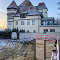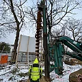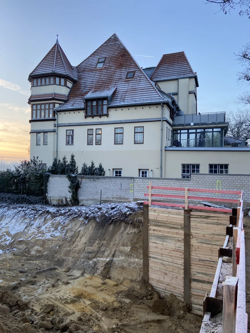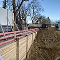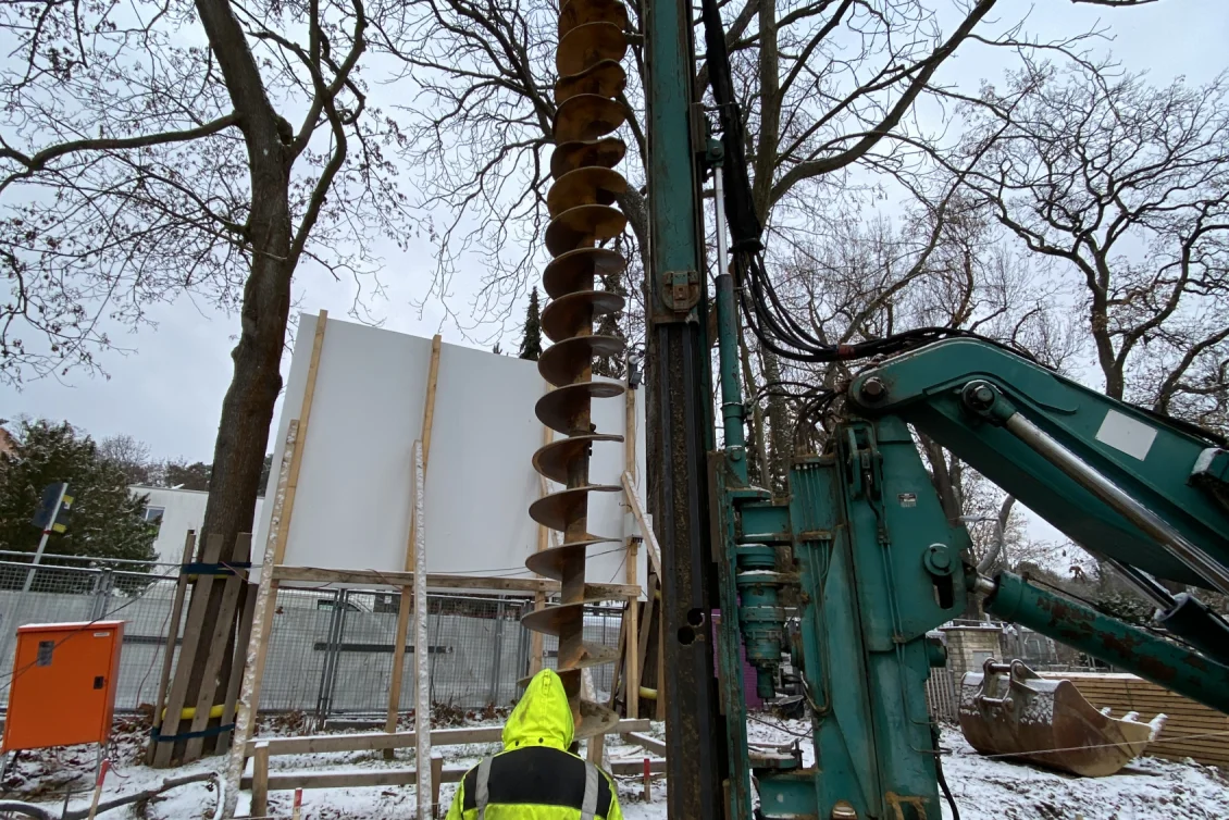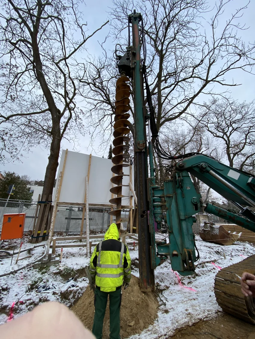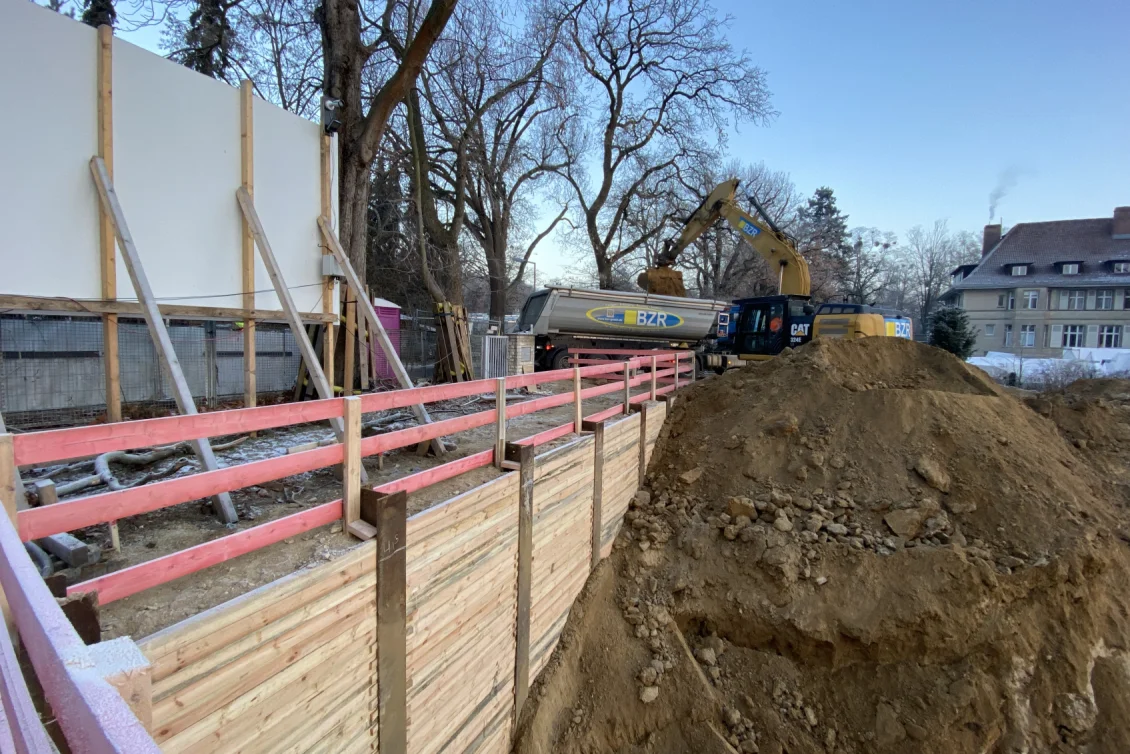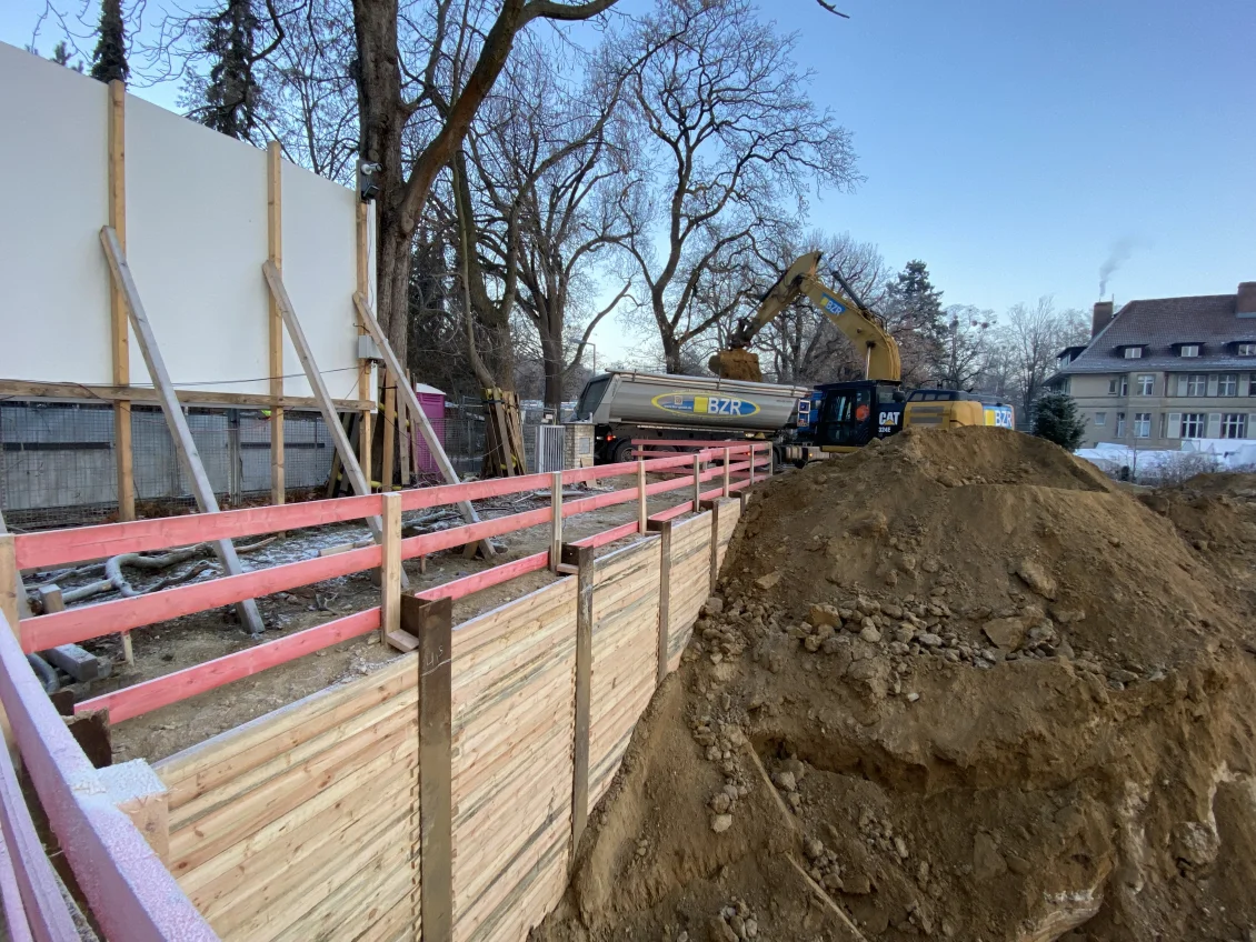 Als Baumschutz wird straßenseitig eine vertikale Baugrubenumschließung als sogenannter “Berliner Verbau” hergestellt. Hierfür werden Bohrungen vorgenommen und über 40 cm breite Stahlträger von 10-11 m Länge im Erdreich befestigt. Zwischen den Trägern entstehen stabile Holzbohlenwände.